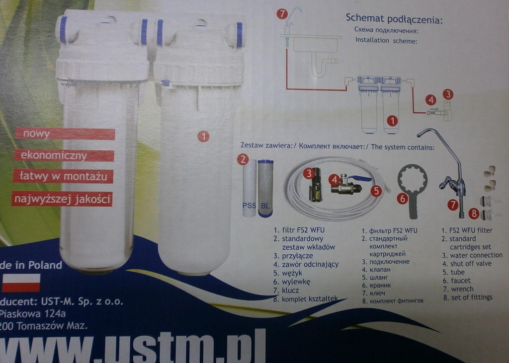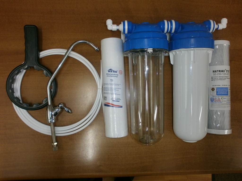 Περιλαμβάνει πλήρες set εγκατάστασης: σωλήνα, ταφ, διακόπτη, βρυσάκι (πιθανόν να διαφέρει από τη φωτογραφία), κλειδί, βάση, 2 δοχεία με κεφαλές, φίλτρο νήματος 5μ και ενεργό άνθρακα 5μ.